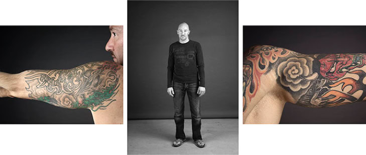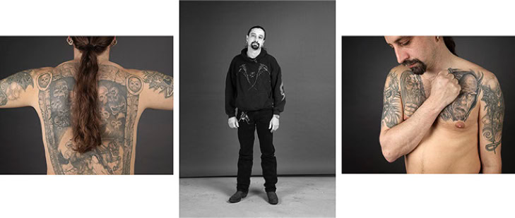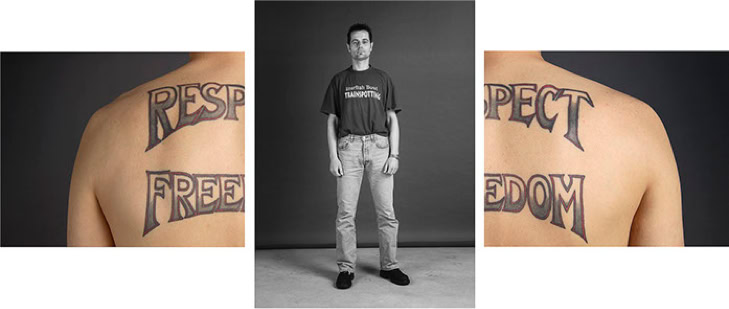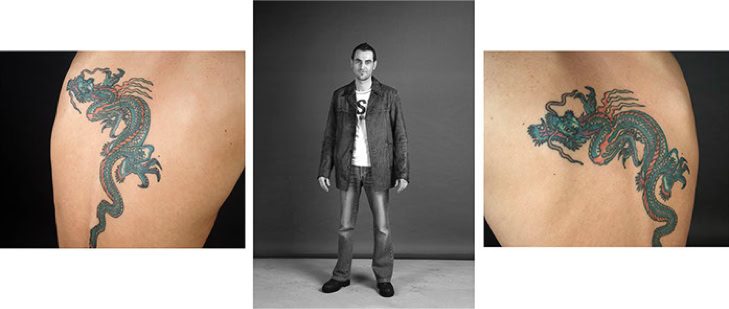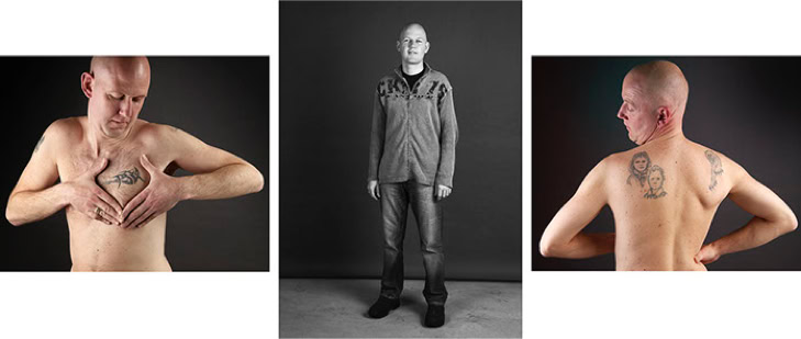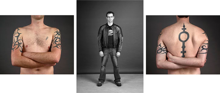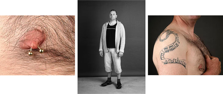 A triptych of each subject's creation is presented in photographic form. The central image is in black and white and depicts the subject as they might be encountered in real life. The two side panels are in colour and focus on the intimacy of the body. As the series progresses, the anonymity of the subjects gradually disappears, and the mystery of their identities becomes more apparent.