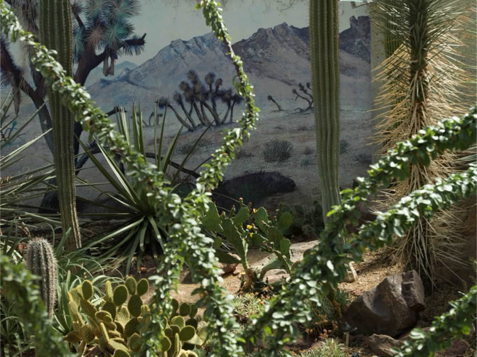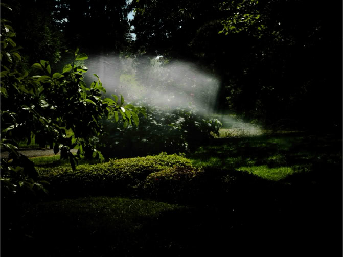 For van Hoef, that is the fascination for metamorphosis, the slow, sometimes sudden, transformation of a place. He named the exhibition and catalog of 2003 Genius Loci, the spirit or nature of the place: it is true that things can change at or in one place, but there remains a certain kind of presence. Shadows often appear in his paintings, which, if you look at them, give the impression of the moment and at the same time suggest a standstill of time, the time is frozen in it or solidifies. But shadows do not stand still, they are on the contrary very temporary, shadows literally change within a minute. The gardens, the fragments or the cut-outs of a built-up environment or a landscape, all of them frozen are at least silent, almost immobile. The experience of time or its absence is his theme.