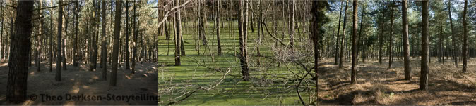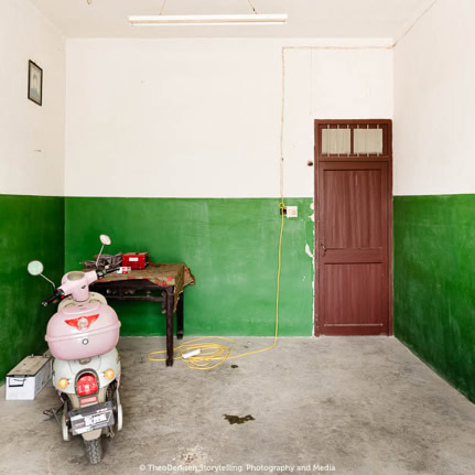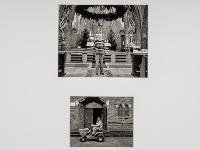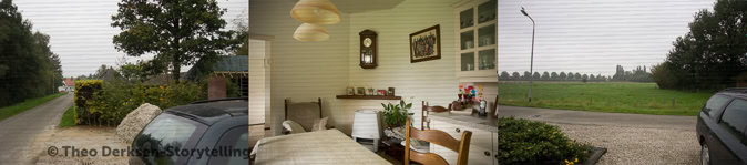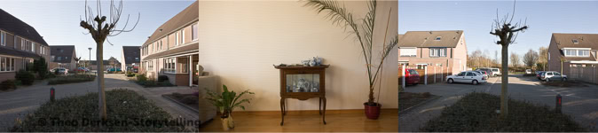 Theo Derksen uses a number of image strategies in a subtle but efficient manner that regularly recur in his work. He uses formal structures that build a relational field of tension between iconographic elements that initially seem to coincidentally coincide. Usually these structures can be understood as a form of juxtaposition. What almost inevitably suggests equality and simultaneity. And consequently also: reversibility. Mutual involvement, without hierarchical coercion or order. The photographs by Theo Derksen seldom have a single, centrally placed motif. On the contrary, the attention is drawn between front and back, characters and decor, left and right, top and bottom, light and dark, open and closed spaces.