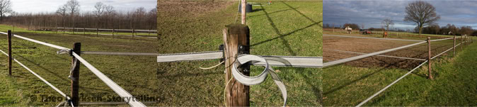 Hoeven en stilstaande paarden zijn op verre heuvels zichtbaar.